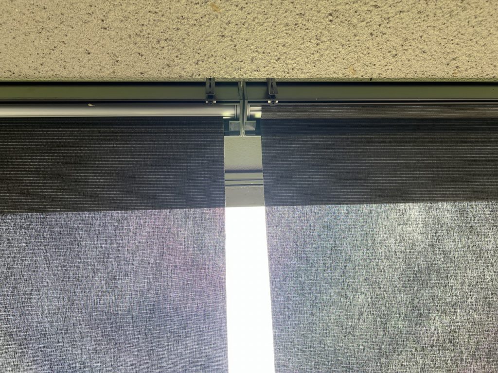 写真は左側(手前)がシェード生地が全て出てしまっている状態、右側(奥側)が正常な状態です。
