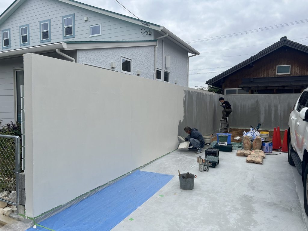 門塀(ブロック下地)とサットフェンス(EPS材)に仕上げの塗装です。
