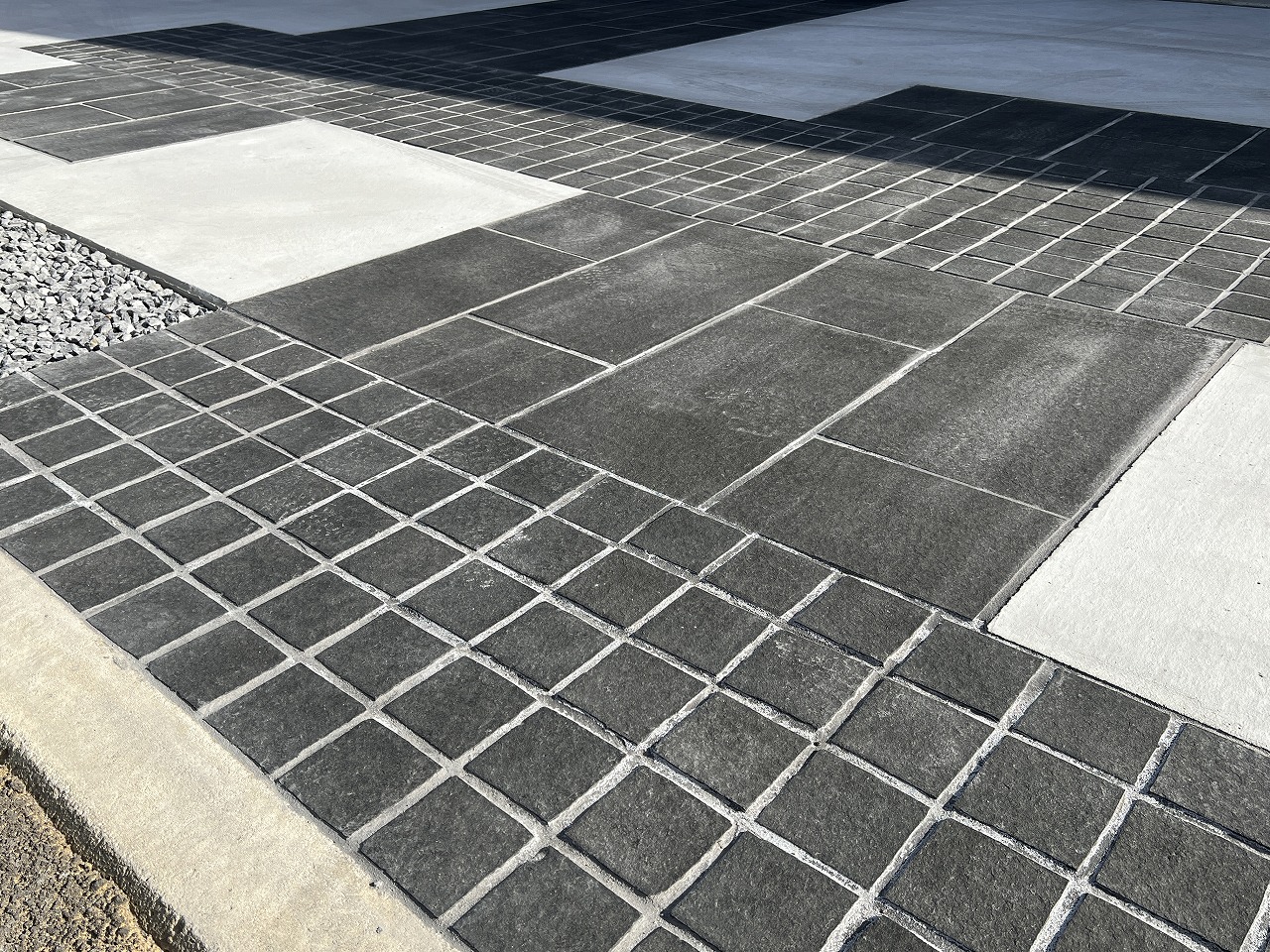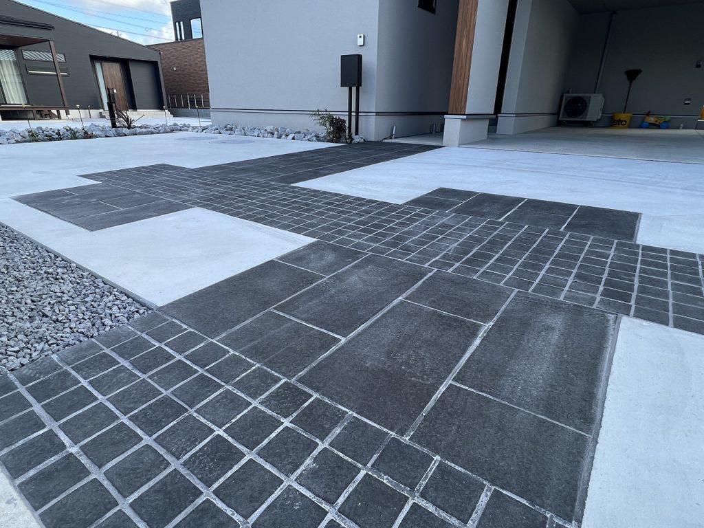 旗竿地で道路から少し距離があるので車を頭から敷地の中に入ります。ビルトインガレージがありますが、車は必ず敷地内で転回するようになります。家の前面は車が転回しやすいように全てコンクリートなどで固めることになりましたが、タイヤ痕がつくのが気になると相談があり、今回はアプローチを兼ねた黒い石張りをご提案しました。